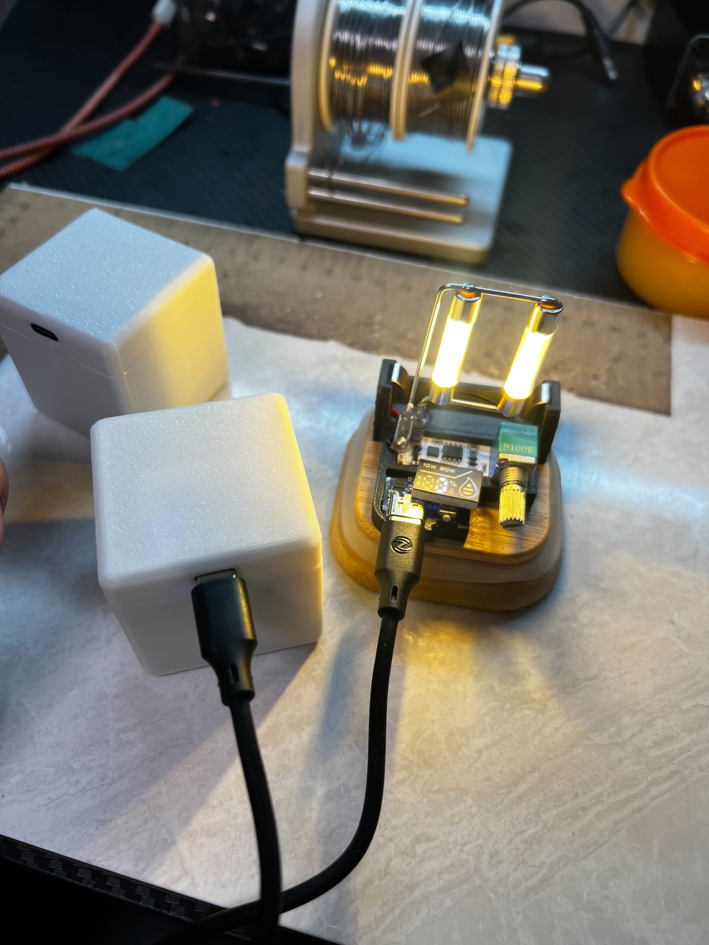 A creative night light that blends industrial aesthetics with handmade craftsmanship. It features core functions like dimmable lighting, a fun mercury tilt switch, 20W Type-C fast charging, and a digital battery display. With a sturdy 3D-printed base and o